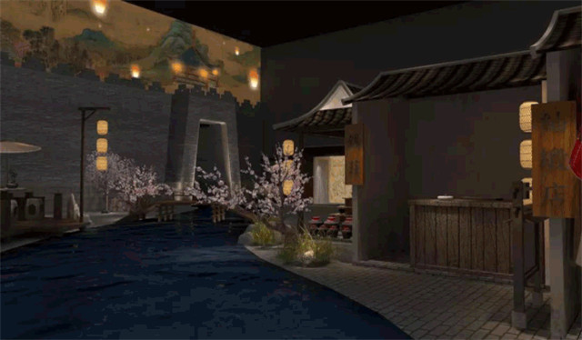在“意盡畫中游”展區(qū),在呈現(xiàn)仇英畫中郊外和皇宮的部分,會使用3DMAPPING+GC全息空氣投影巨幕畫面去動態(tài)展現(xiàn)晝夜更替的場景,并在畫面中融入互動展示技術(shù),讓參觀者的作品同步融入畫卷,還原明朝當(dāng)年的祈福風(fēng)俗:白天放風(fēng)箏,晚上放天燈等;在貫穿場景的河道中,參觀者可以從不同角度觀賞到日間的游船和夜間的河燈貫穿其中。我們應(yīng)用感應(yīng)技術(shù),讓河道里的人們和小魚產(chǎn)生互動,體驗不一樣的水岸樂趣。在大宅院的空間中,在蘇氏建筑中展示四季變化的園林意境。
